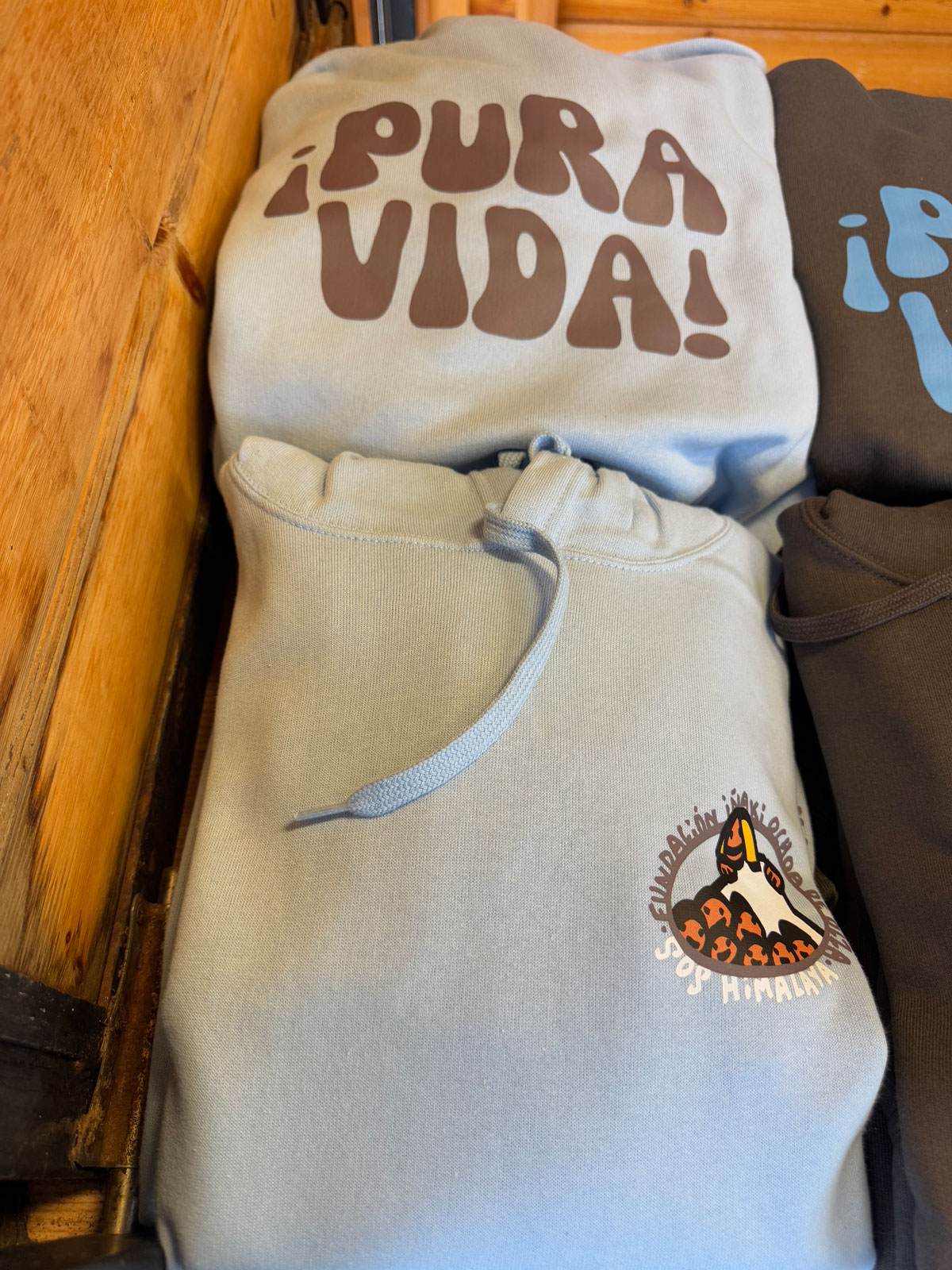 Impresión con el logo de la Fundación Iñaki Ochoa de Olza-SOS Himalaya en el frontal y la frase ‘¡Pura Vida!’ en la trasera. Disponible en color gris y azul celeste.